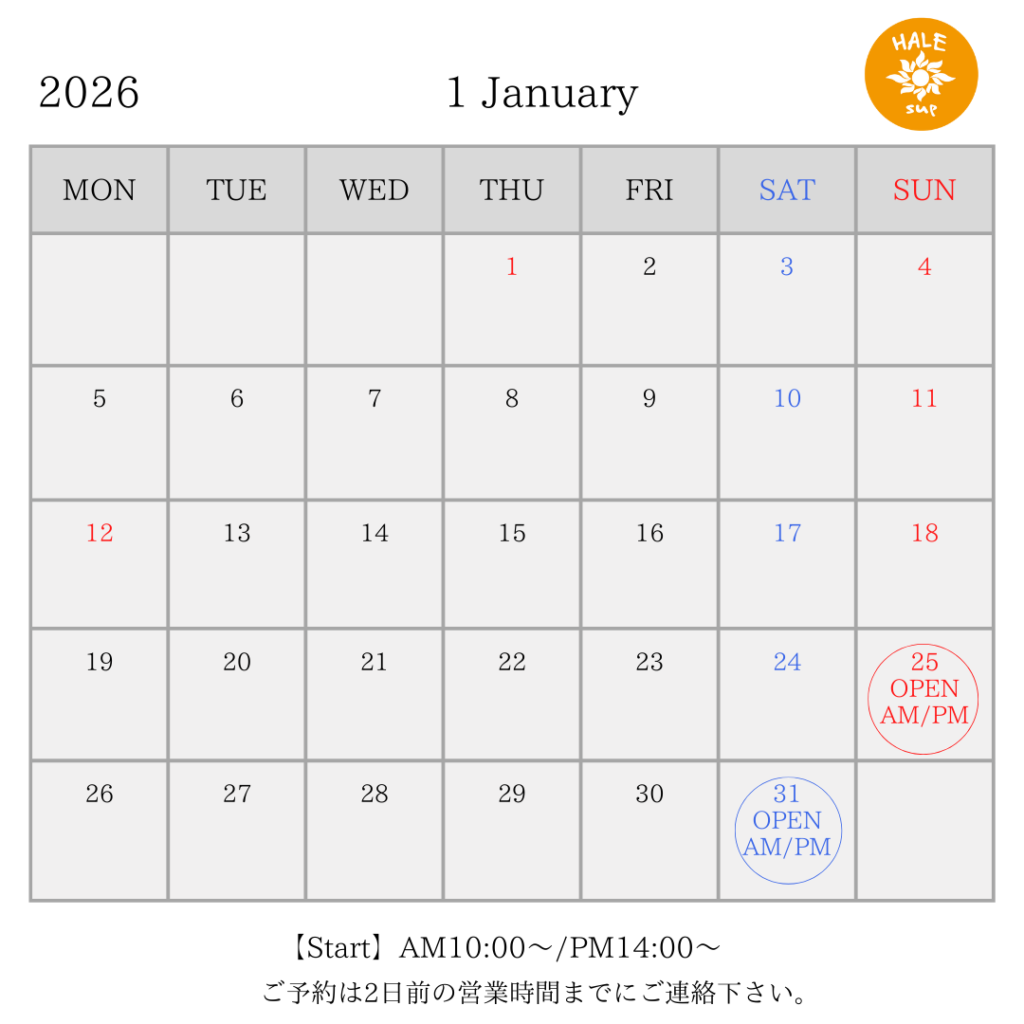 いつもHALESUPをご利用いただきありがとうございます! 1月のSUPスクールスケジュールです! 空気も水も透き通っていて気持ちいい季節! 江の島も富士山もくっきり見えて綺麗です! ご予約お待ちしております!! ※AM10:00〜 /PM14:00〜 ※予約の締切は、前... -